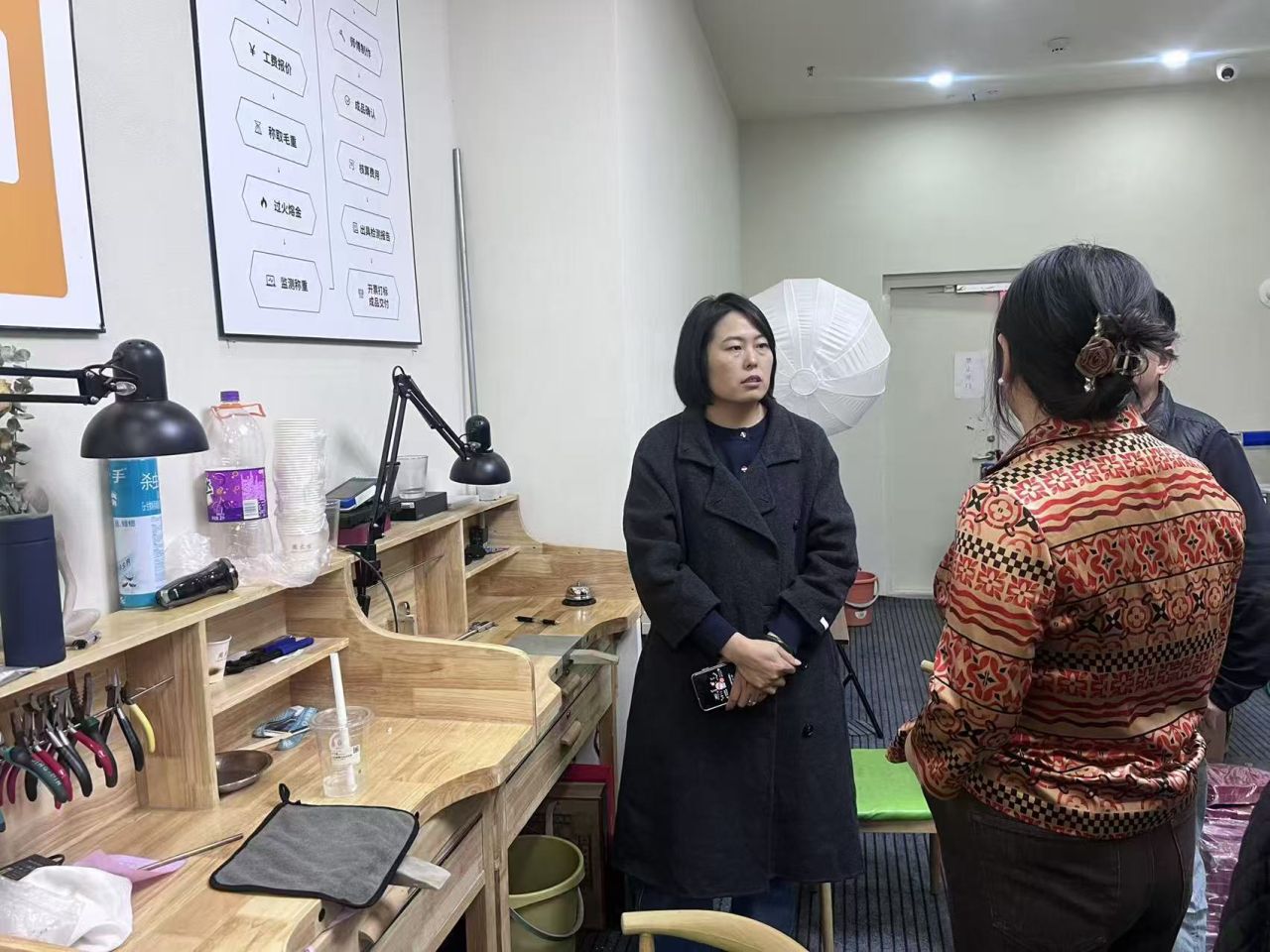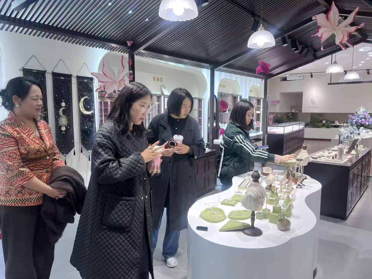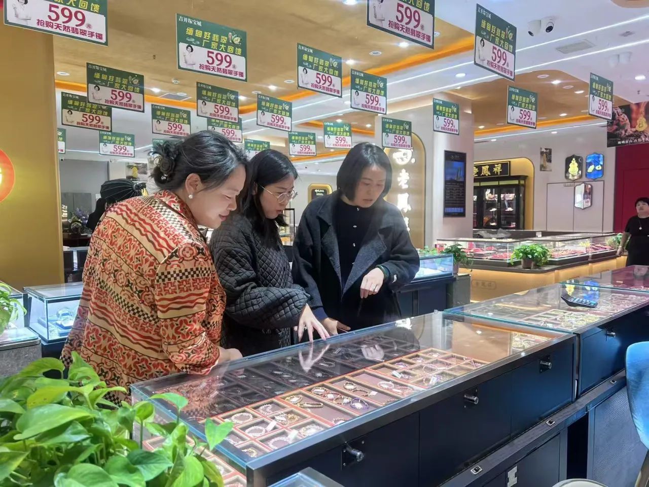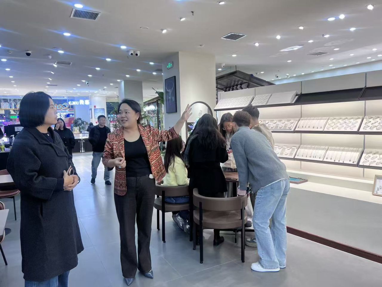 座谈结束后,在石家庄吉开珠宝城管理团队的陪同下,金翠玲副院长、辅导员张曼琳实地参观了珠宝城的产品展示区、定制加工车间、鉴定检测中心与门店运营现场。在定制加工车间,双方就“古法金工艺传承”“新媒体运营”等行业前沿话题展开交流,金翠玲副院长表示,后续日本av片