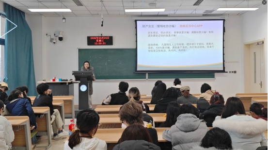 3月5日,在教一403教室,辅导员边泓旭引导学生注重保持健康规律的生活习惯,积极培养理性平和的心理调适能力,并结合典型案例解析,帮助学生强化对各类电信网络诈骗的防范意识,切实提升风险辨识与自我防护能力。